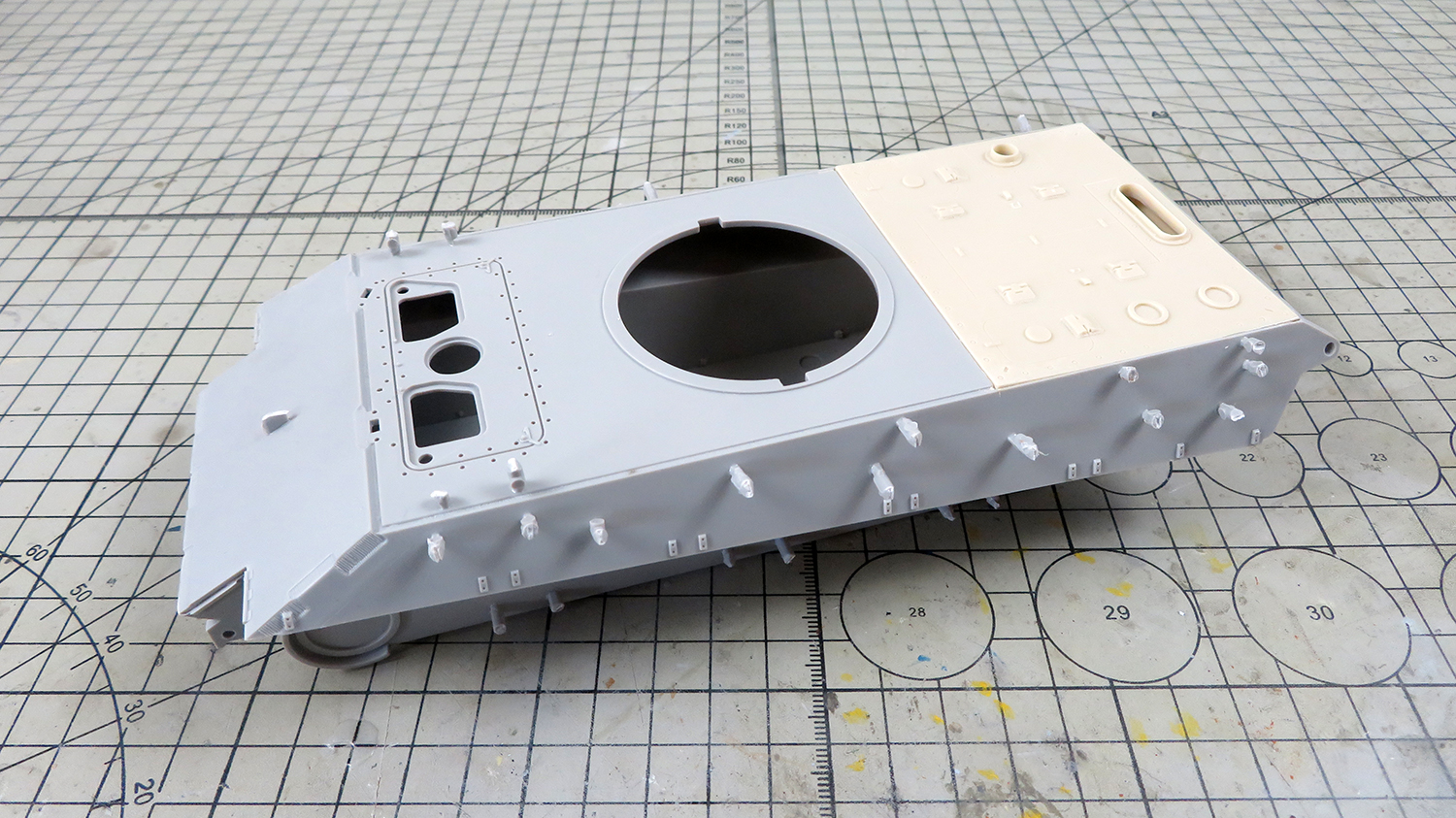 I made start on my build, I glued the upper and lower hull together along with a new resin rear plate. I had a bit of trouble fitting the hull together, I'd presumed the issue was the resin part but on closer inspection I found that the plastic hull was warped and the resin was perfectly straight ;D After some sanding and clamps I managed to fit it together tho.