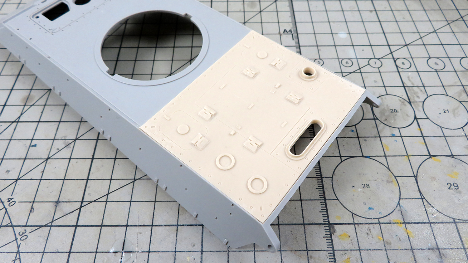 Paper Panzer Productions GT103 gas turbine engine. I cut out the original Maybach engine deck and added the new resin one about 5 years ago in anticipation of this build. The E-50's Maybach deck then ended up on an E-100 after I bunched it and need a replacement
