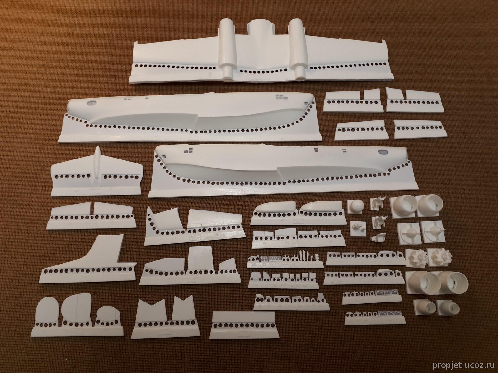 The set includes 70 names of parts from polyurethane resin, vacuform canopies, stand, decal "Begemot" , instruction - two A-3 sheets and the rest.