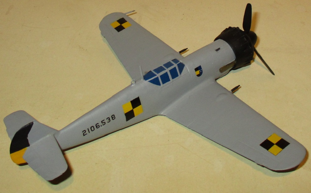 The old hairy stick was trotted out and loaded up with a lot of Polly Scale SP Lettering Gray acrylic. The canopy was tinted on the inside with Testors Royal Blue. Guns were given a custom mix as were those exhausts. The rudder stripes were done freehand in Flat Black and Insignia Yellow.