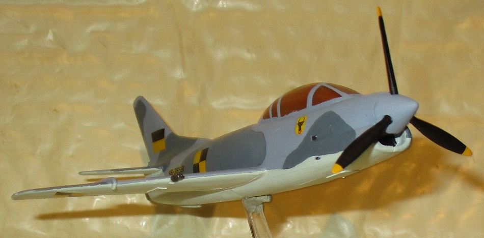 Of course, mine was going to be a bit different. Upon opening the bag, I noticed the nose cone was a separate piece and could be replaced with the prop from an Airfix P-40 to make this a turbo-prop. There's not enough turbo-prop fighters if you ask me and this baby was ripe for such treatment. I started by blanking off the intake and inserting a slice of plastic to cover the gap below the prop.