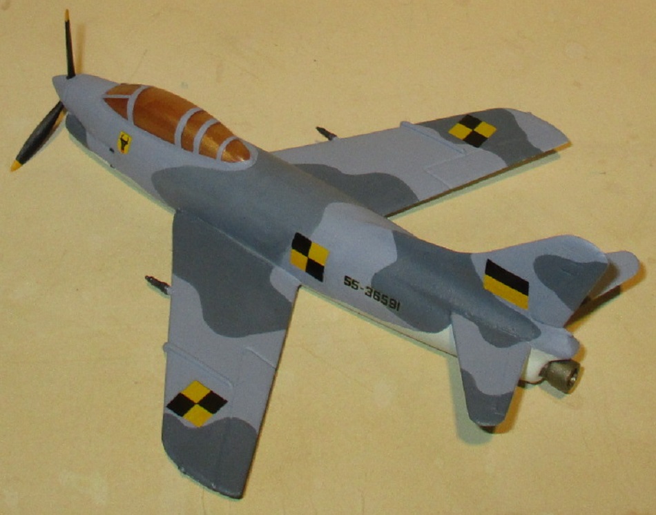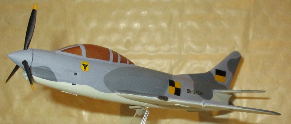 The canopy was tinted on the inside with Testors Gold and the guns were given a custom mix. The exhaust pipe was done in Model Masters Drab with a top coat of Jet Exhaust.