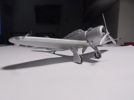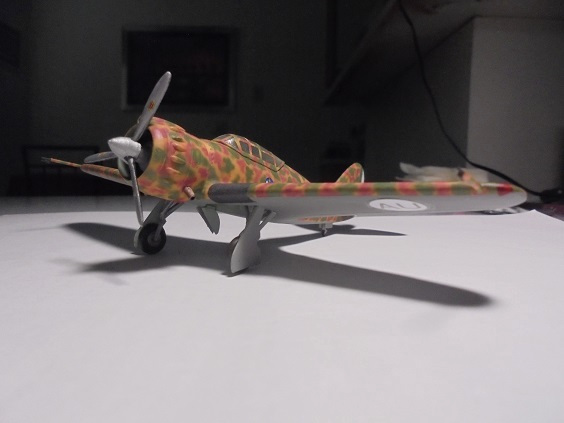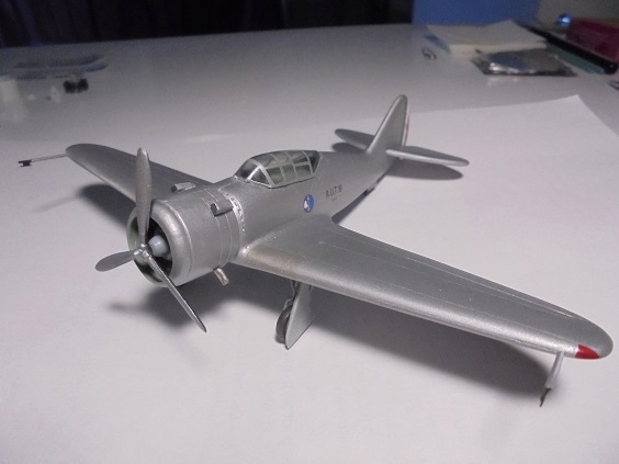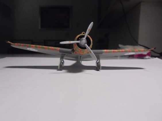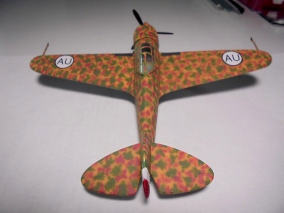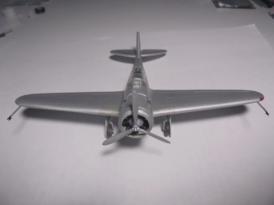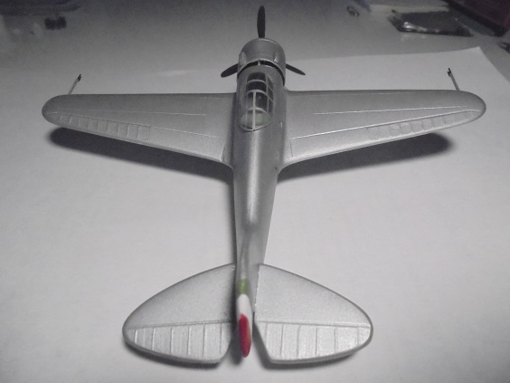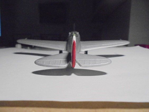 - > Holes drilled in mainwing leading edges near tips for Pitot tubes, navigation lights on tip masked-off, spray-painted Testors Flat Green & Model Master Insignia Red enamels, good results.