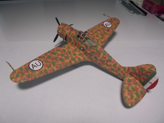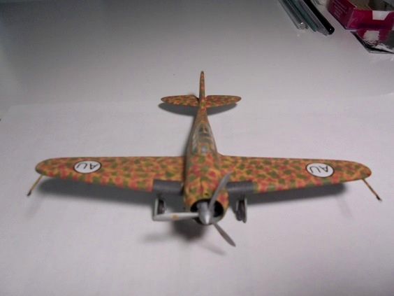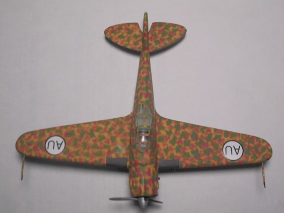 - > Largely assembled model uppersides & wrap-around mainwing & tailplane leading edges base spray painted Humbrol 63 Matt Sand + 10% Testors Flat Yellow + 36% Flat White shading replicating Giallo Mimetico 3, OK results.