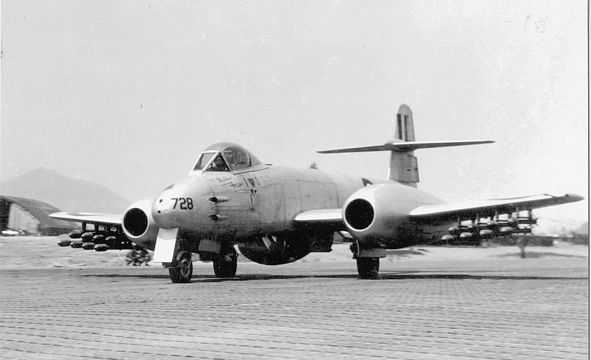 Royal Australian Air Force Gloster Meteor F.8, Serial No. A77-728, fitted with sixteen RP-3 60lb ground attack rockets during Korean War.