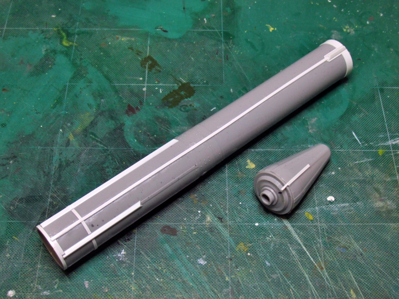 While that was drying down, I worked on the nose cone. I was just going to glue it to the top of the rocket, but then I decided to make it removable, so I made a base from one of the many inside pieces left over(the original kit is designed to open, so you can see the internal structures).