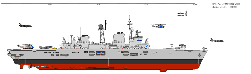 This particular ship is fitted with an angled flight deck and two catapults which, despite being merely 61m and 46m in length, can each launch a fully-laden F-4K Phantom (the standard naval fighter of N.C.T.O. forces at the beginning of the invasion) although onboard ordnance stowage means that versatility of the onboard airwing is relatively limited compared to those serving fleet carriers. This airwing also included both ASW and AEW variants of the Sea King helicopters. To make room for the flight deck and a hangar below it, the original aft armaments are removed. The remaining twin five-inch guns are removed as well, replaced by four more-modern ones that despite being single-barrelled are automated, faster-firing, and having a longer range. Four quad anti-ship missile launchers were installed amidship, and two point-defense missile launchers and three 12-barrelled 20mm autocannon turrets rounded out its air-defense weapons suite. The ship's command and control system upgraded, an electronic warfare systems set installed, as were new 2D and 3D search radars.