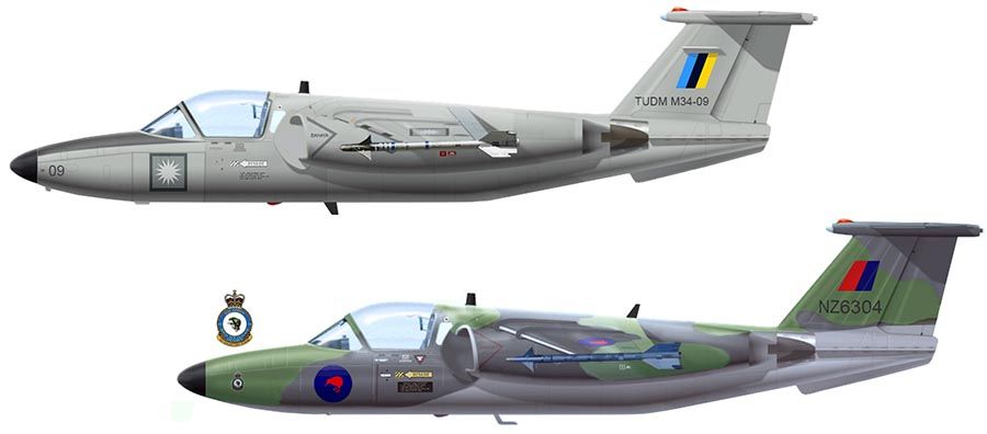 Top: M34-09, a Malaysian Saab 110 Pepatung (Dragonfly) which replaced TUDM Canadair Tebuan COIN/trainers. This aircraft is operating in a light air defence role with Sidewinders on the wingtip rails but without underwing pylons fitted.