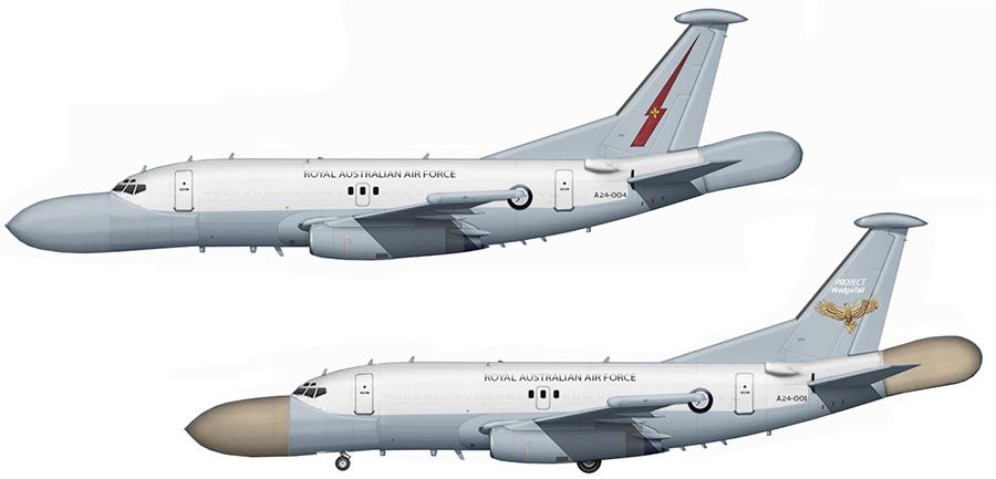 Above:  RAAF 737 Wedgetail AEW&C aircraft.  The top shows a standard version serving with No. 2 Squadron while the lower image is of one of the prototype aircraft during development.