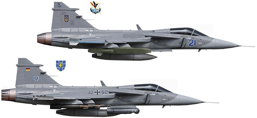 Top: Saab JAS 39C Hryfon (Griffin) as introduced into PS ZSU service in 2025 with the 299-ta bryhada taktychnoyi aviatsiyi. Former Luftwaffe markings have simply been overpainted to speed Ukrainian service entry.