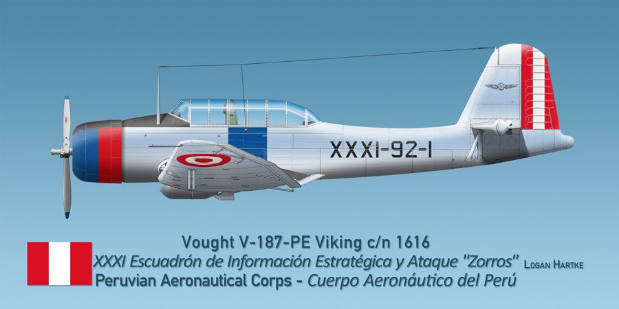 In 1939, Lt. Cmdt. Armando Revoredo Iglesias CAP traveled to the United States to oversee the purchase of new aircraft, among which were the Vought V-187. The Vought V-187-PE was an export version of the Viking for the Cuerpo Aeronáutico del Perú. A total of ten V-187-PEs were built (company numbers 1612 to 1621). On June 1st, 1939 the first three aircraft took off from the Vought factory, commanded by Revoredo himself, for their over 7,000 mile delivery flight to Lima. They arrived on the 5th of June after a direct flight from Panama, landing at Limatambo Airport at 5:45pm. After arriving, they were assigned to the XXXI Escuadrón de Información Estratégica y Ataque "Zorros" (31st Strategic Reconnaissance and Attack Squadron "Foxes") based in Las Palmas.