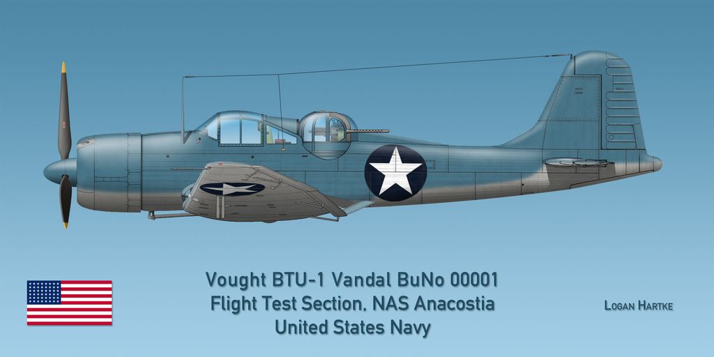 Since there was no true BTU prototype, the first BTU-1 Vandal was BuNo 00001, which first flew on 30 June 1942, less than a week after the first production F4U-1 took flight. Unlike many of the other new Navy aircraft entering service around this time, however, production ramped up quickly since it was a modification of the existing SB4U Viking airframe and many of the components were unchanged. The cockpit was raised to help with visibility around the new, larger R-2800 engine. A new horizontal tail was created to replace the draggy, externally braced horizontal stabilizer that was a holdover from the original Junkers Ju 87 V4 prototype purchased by Vought back in 1936.