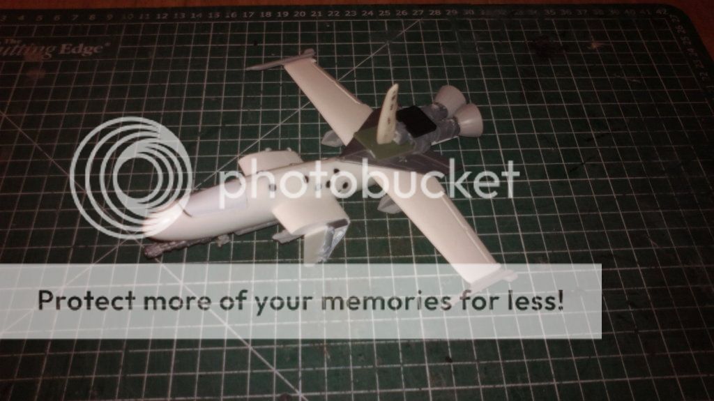 Glue the remains of the wings together to form one mainplane, and attach it to the slot at the fuselage rear.  Now pin the engines to the top of the wings, and cut/find a fin to sit in front of the engines. Now attach your choice of wingtip / underwing pylons.