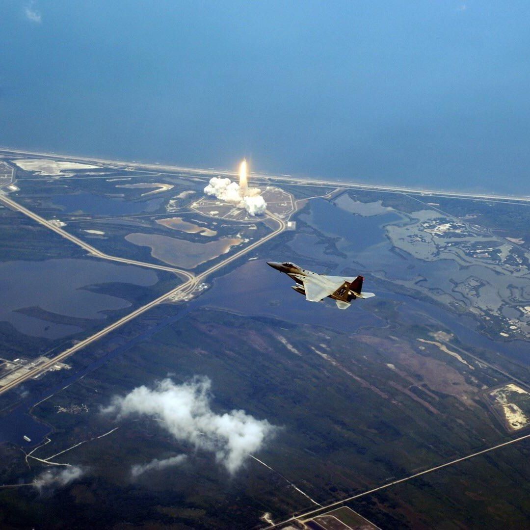 An F-15 patrols the skies over the Kennedy Space Center during the launch of a space shuttle (unknown mission). Credit: NASA/USAF