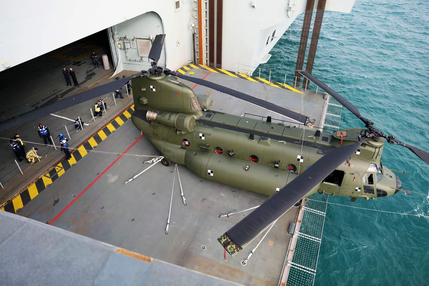 "An RAF Chinook in one of the elevators of HMS Queen Elizabeth. Although not part of the usual complement, the ship is certified to operate them and provide heavy lift capability to combined operations".