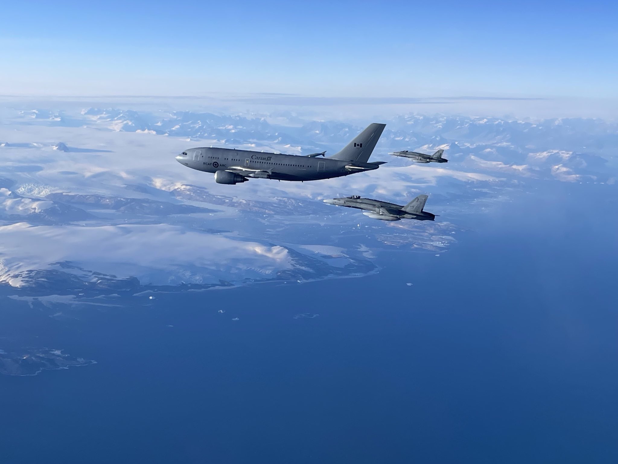 Several  @RCAF_ARC CF-188 Hornets from #409Sqn returning to Canada after Exercise #CobraWarrior were refuelled by a CC-150 Polaris over Greenland.
