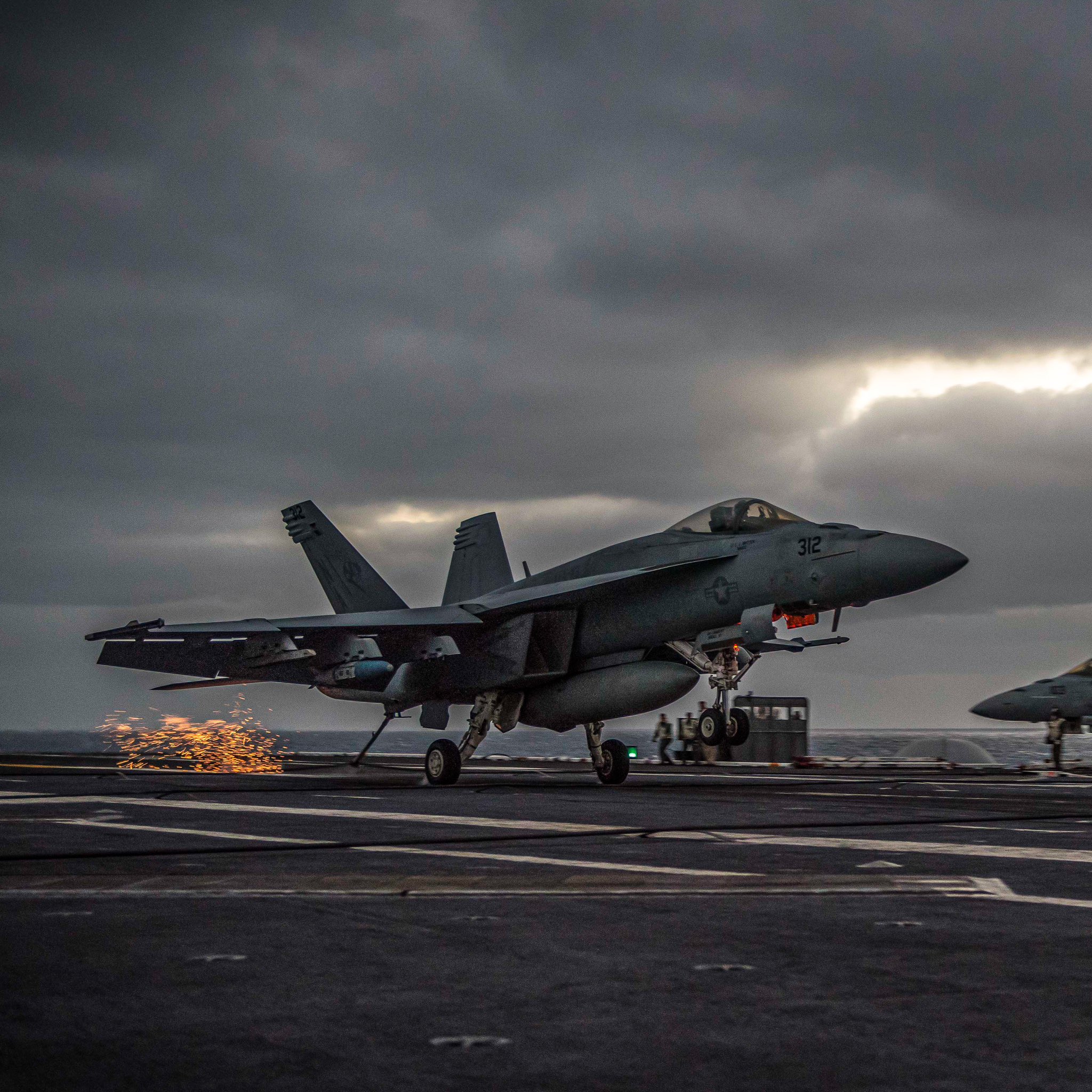 An F/A-18E Super Hornet assigned to the Stingers of Strike Fighter Squadron (VFA) 113 lands on the USS Theodore Roosevelt. (s. roberts)