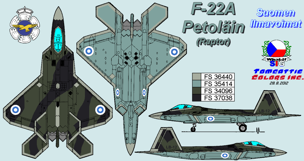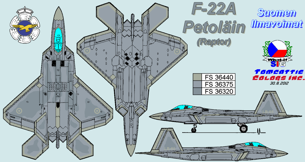 the F.22, definately different (i recently completed a model of the similar Sukhoi T.50 in Finnish colours as a JSF. alternate !) id love to see a profile of one in 'standard colours' grey tones but with the Finnish reduced size roundels possibly with a pale grey replacing the white on the marking ?