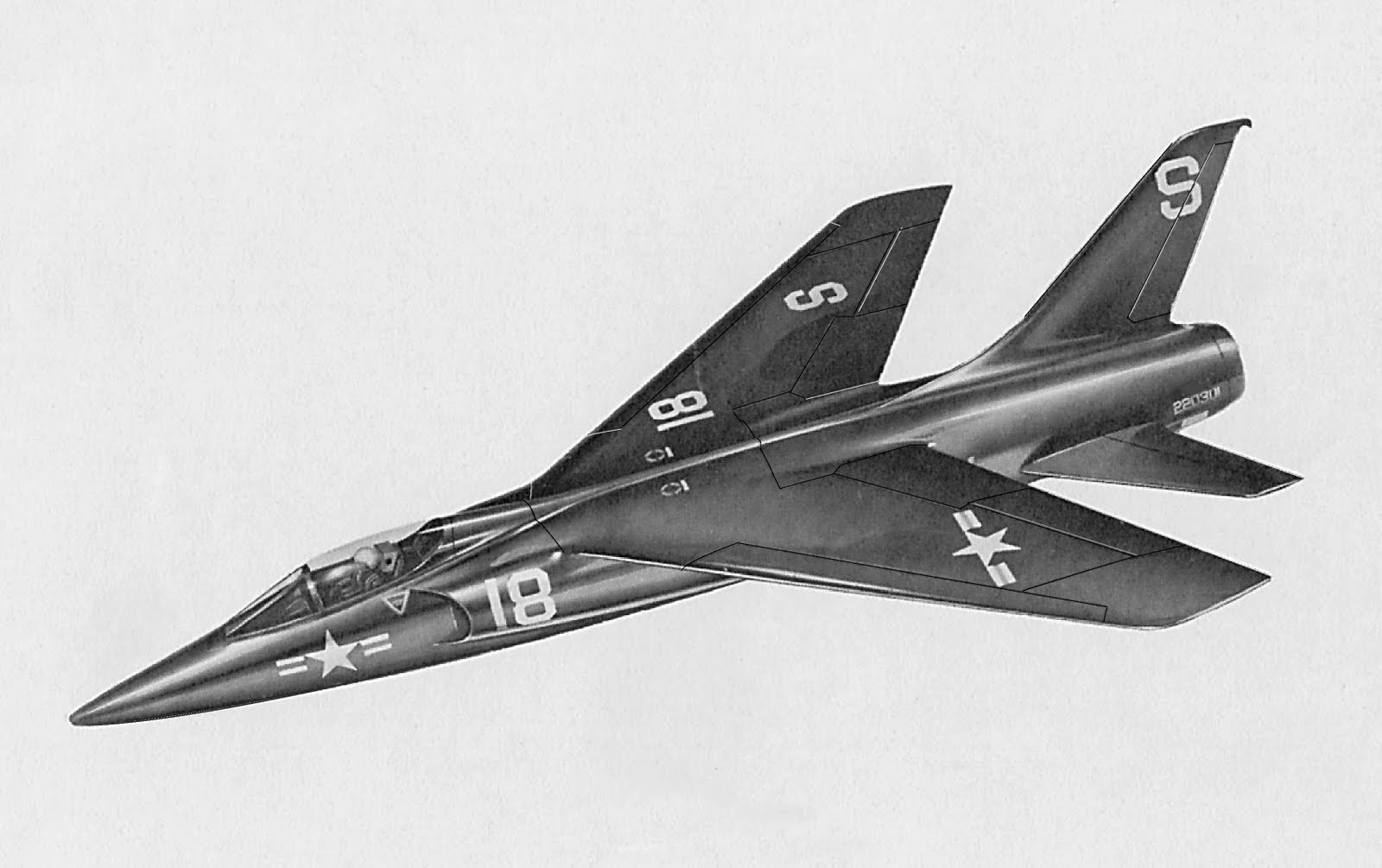 A basic F-100 airframe with strengthened undercarriage, arrestor hook, a modified vertical stabilizer to allow for hangar deckhead clearance, an angled intake to improve airflow at high AoA and of course... folding wings.