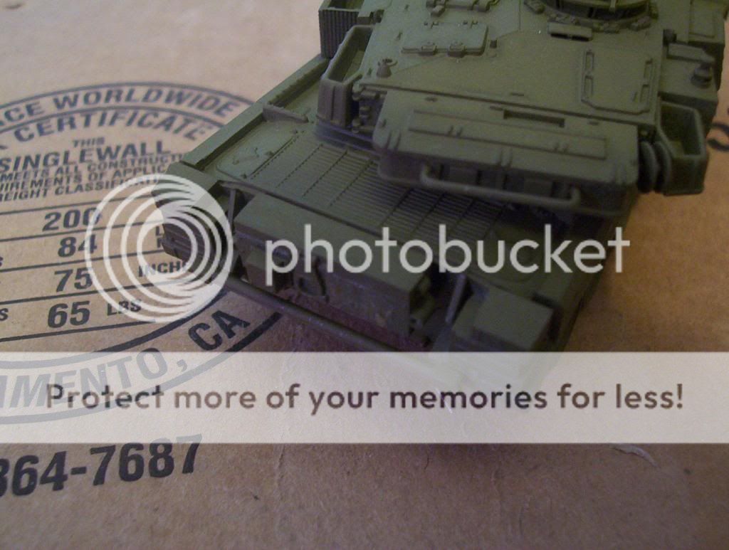 I'm trying to decide now how to proceed; aside from some minor stuff there's still the treads and the skirting to apply (for the skirting I'll be using a mashup of the Chieftain and Challenger skirts), and of course painting. I'm wondering if I should paint everything now with the skirts separate, and then attach the treads and the skirting after all the painting is done, or finish the assembly, tracks and skirts and everything, and then paint it, including painting the treads black(ish) again...