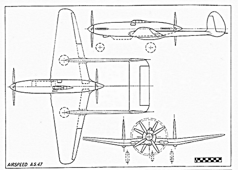 The AS.47 was a twin-boom, twin fin device with a. wide-track tricycle undercarriage, but otherwise somewhat reminiscent of the Fokker D.XXIII in that it had tractor and pusher engines with, between them, the crew of pilot and bomb-aimer-navigator. The pilot’s cockpit, with its windscreen and canopy, was offset slightly to the port side of the nacelle, and the bomb-aimer was accommodated to his right and below. No doubt means had been considered of abandoning the aircraft in emergency, but on the face of it the crew did not seem to have much chance unless the pusher propeller could somehow have been jettisoned by explosive means. The estimated performance was, however, attractive.