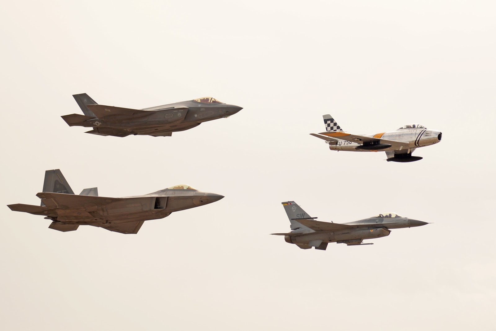 Classic lineage - formation shot of the legendary NAA fighters, taken over Fort Wayne Indiana.