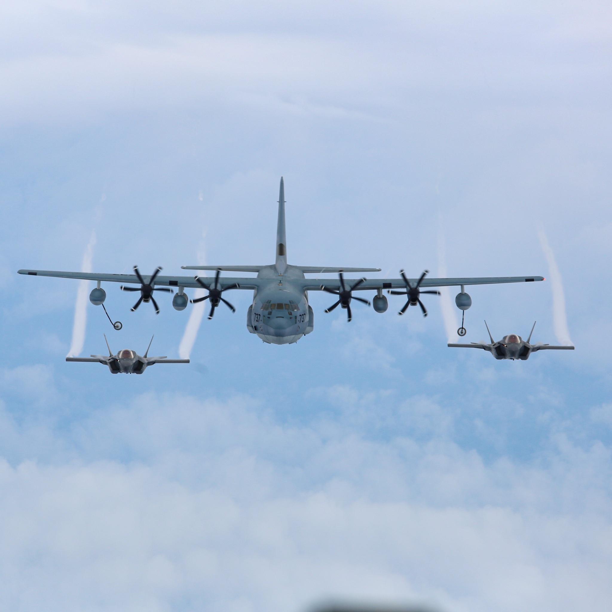 A U.S. Marine Corps KC-130 flies with two F-35B Lightning II Joint Strike Fighters over Beaufort, SC. (U.S. Marine Corps photo by Lance Cpl. Olivia G. Ortiz)