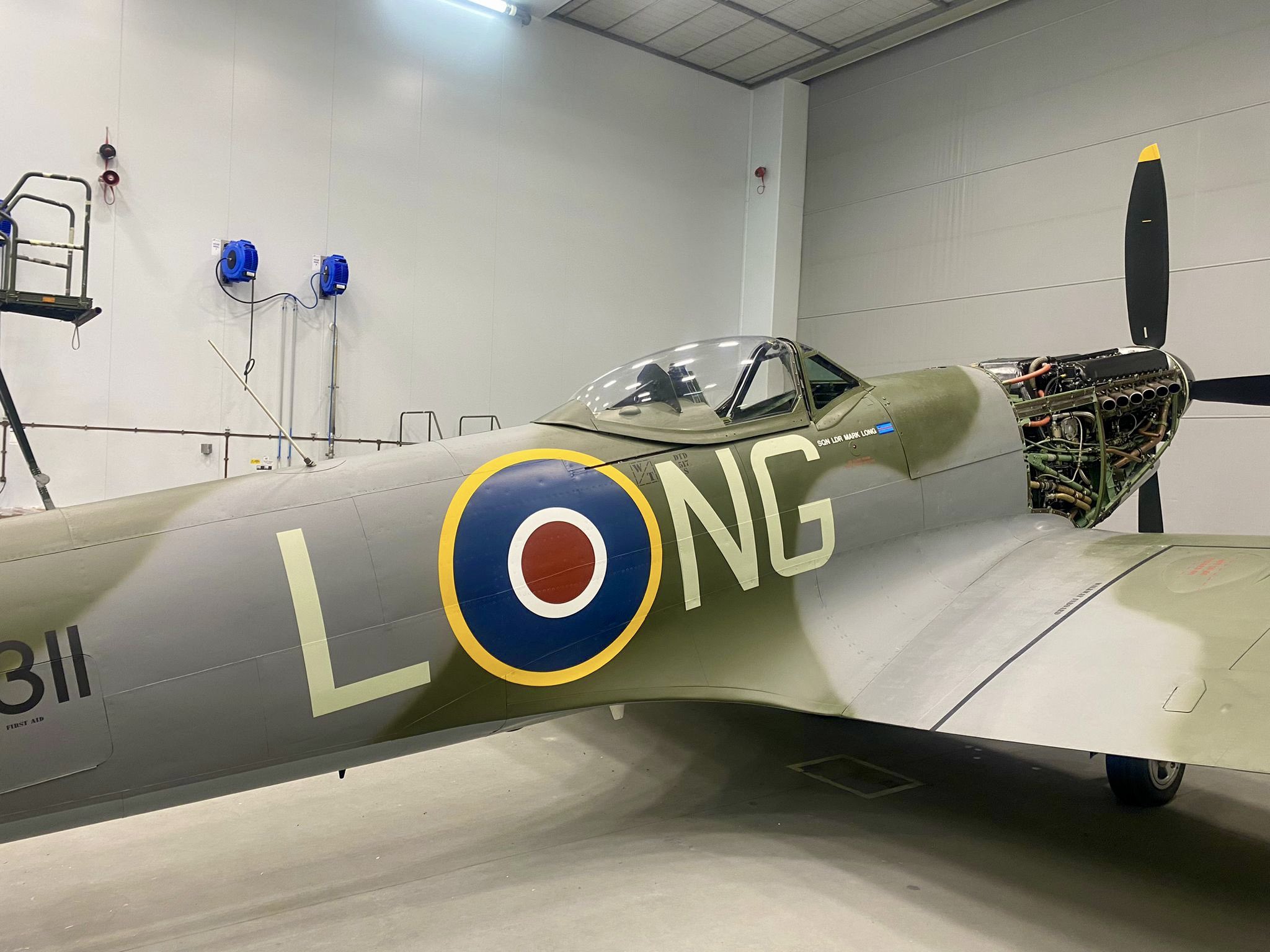 On her Star Board side, TE311 now wears the fictitious squadron code “L-NG”, with Sqn Ldr Mark Long annotated under the cockpit along with a Sqn Ldr pennant.