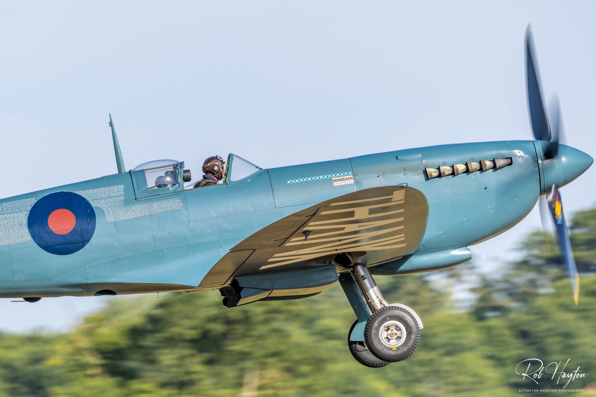 Text: A closer-up view of Mr Jon Gowdy as he gets airborne in the Aircraft Restoration Company Mk. PRXI Spitfire PL983 at the Shuttleworth July Evening Airshow in 2022…⁦