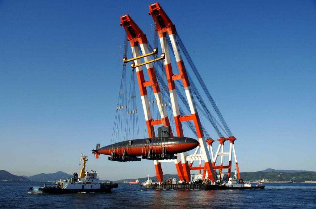 Text: JS Akishio (SS-579) being hoisted whole by a crane barge; photo taken September 24, 2006.
