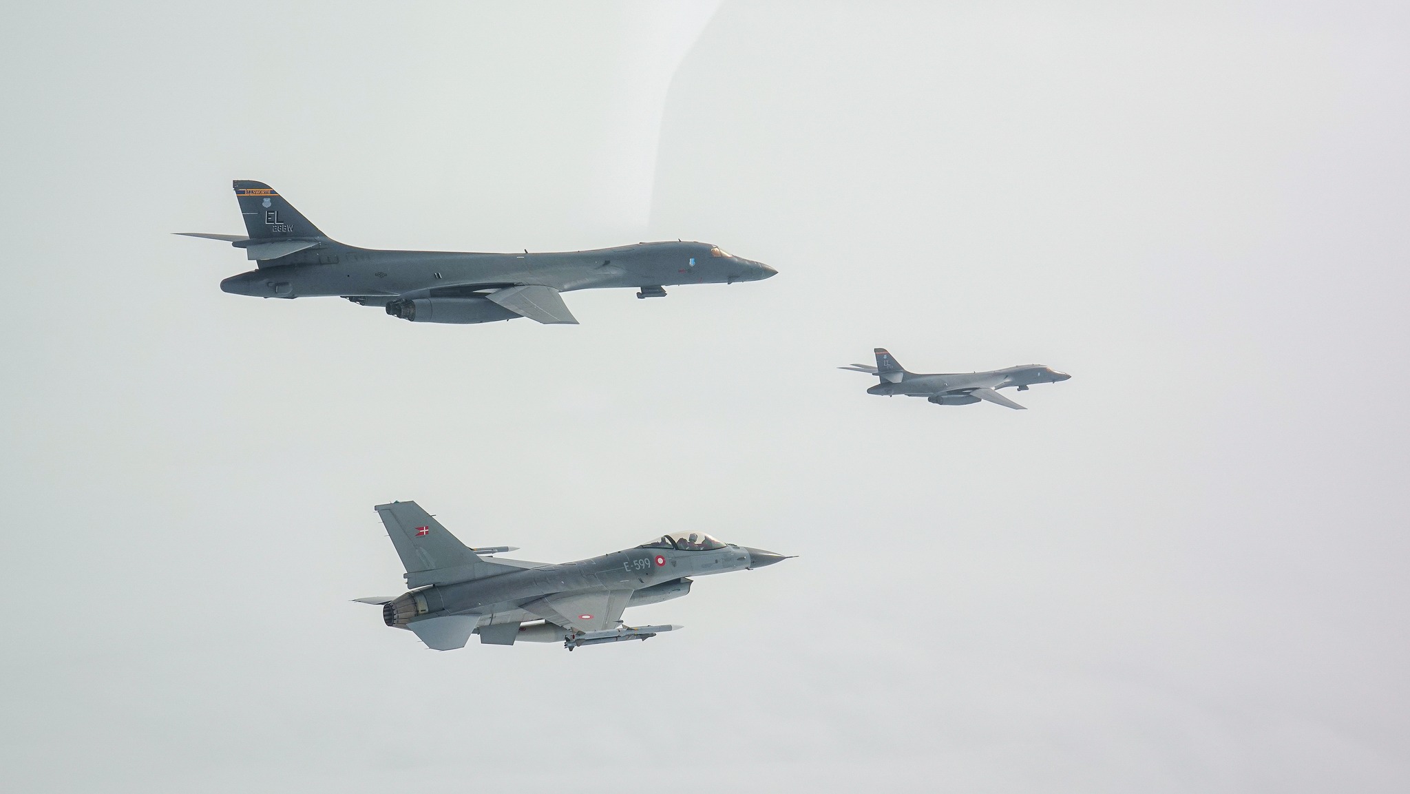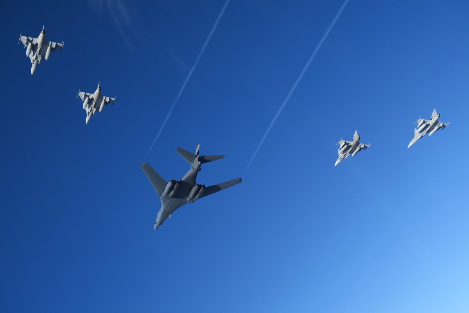 A U.S. Air Force B-1B Lancer assigned to the 28th Bomb Wing sits on a the ramp alongside two Saab JAS 39C Gripens at Luleå-Kallax Air Base, Sweden, Feb. 26, 2024, during Bomber Task Force 24-2.