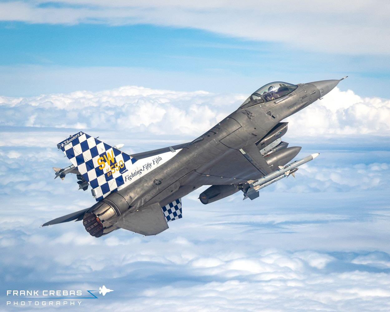 Flagship of 55th FS ‘Shooters’. This aircraft is sporting new radar-absorbing Have Glass paint scheme that USAF F-16s are currently getting.