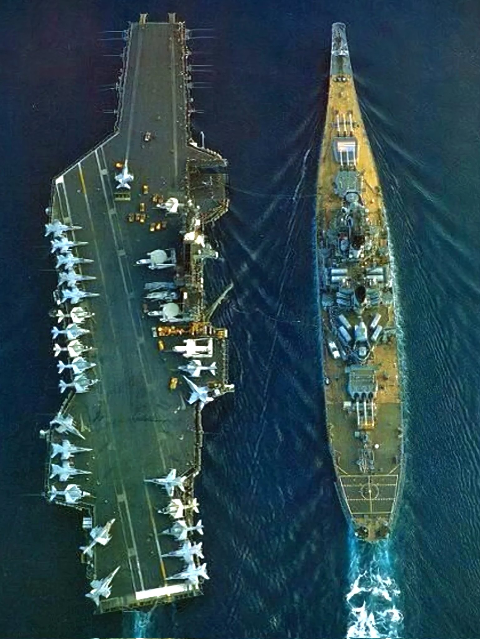 USS Iowa (BB-61) alongside the USS Midway (CV-41), as the two made their way into the Indian Ocean (Dec 1, 1987)