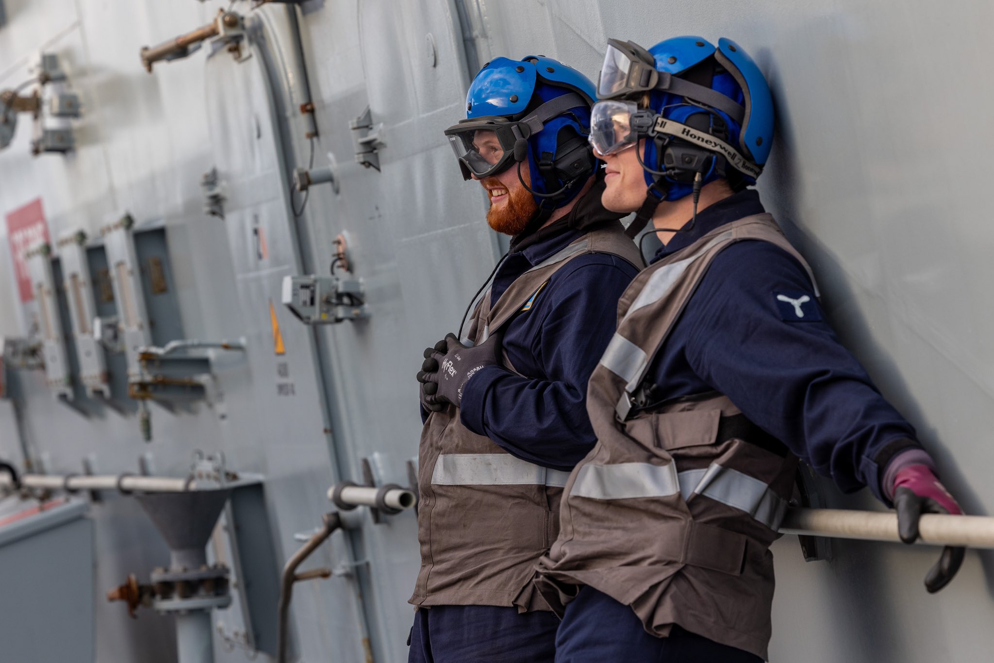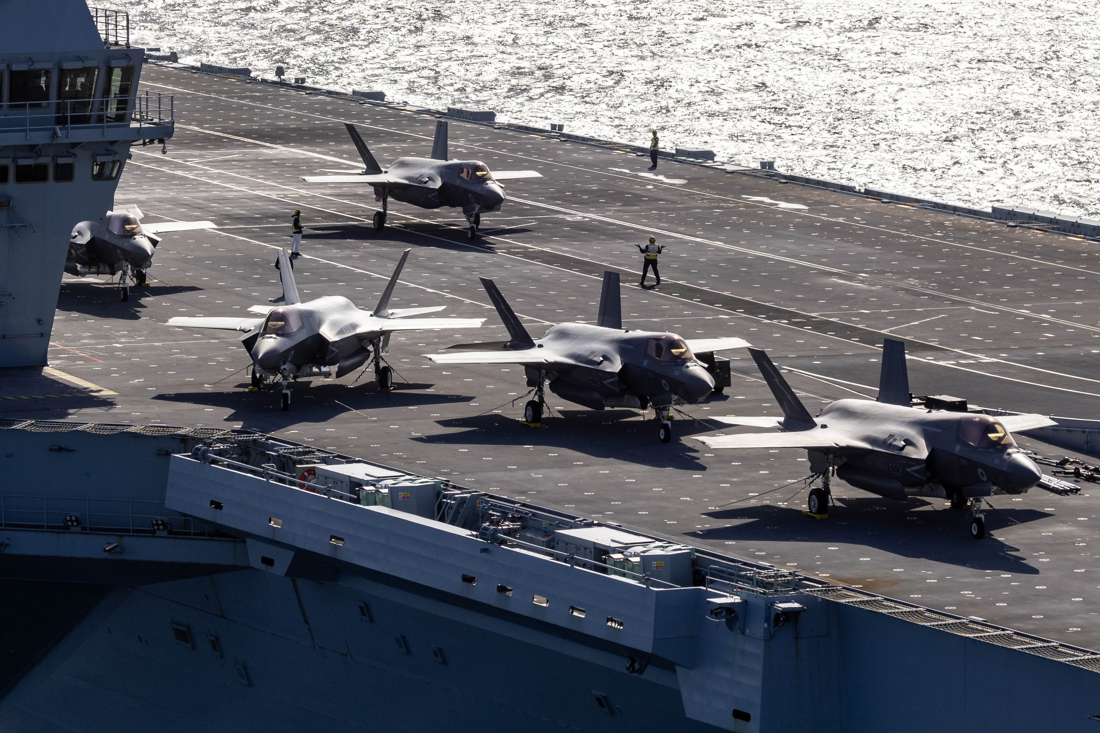 617 Squadron and 809 Naval Air Squadron engineers conduct a 'hot pit refuel' of an F-35B Lightning jet during consolidation training on HMS Prince of Wales.